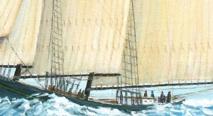 "Reefing" sails was a way to take in some canvas when high winds would put too much strain on the the sails. With the upper boom lowered slightly, canvas was gathered in and the reefing points on either side of the sail would be tied around the lower boom, and secured with a "reef knot" (also called a "square knot"). With the reef points secured all along the boom, the sail would present less area to the strong wind, which in turn put less strain on the ship's rigging. You will notice that the sails shown in the painting have two sets of reefing points. If sail is taken all the way to the second set of reefing points, the sail would be "double reefed".