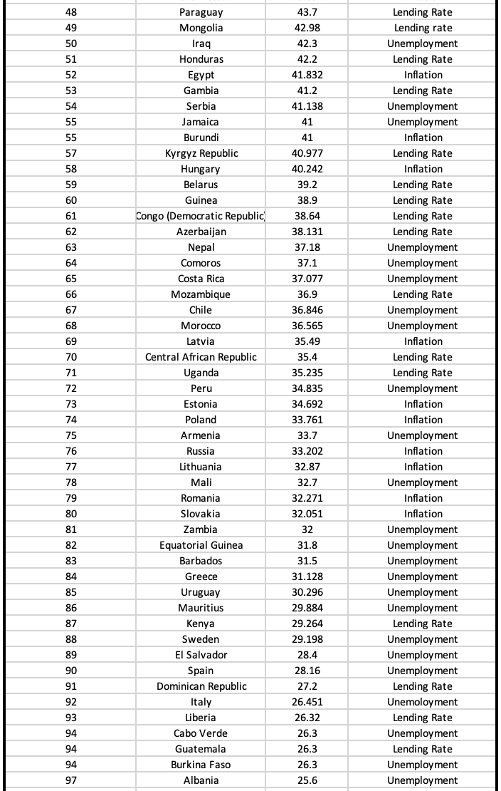 Zimbabwe takes this year’s prize as the most miserable country in the world. Since the reign of Robert Mugabe, which began in 1980, and then his successor, Emmerson Mnangagwa, the political party ZANU-PF has had an iron grip on Zimbabwean politics. Indeed, ZANU-PF operates more like a political mafia than a political party. Its policies have resulted in massive misery. For example, Zimbabwe has suffered endemic inflation since the Mugabe era, including two episodes of hyperinflation, in which the inflation rate (a component of the HAMI), exceeded 50 percent per month for 30 or more days. Last year didn’t deliver much better, with annual inflation at 243.8 percent, and lending rates following suit at 131.8 percent. With elections around the corner, Nelson Chamisa and his Citizens Coalition for Change is polling well, and, on the assumption that there will be fair and free elections in Zimbabwe, he just might pull Zimbabwe out of the gutter.