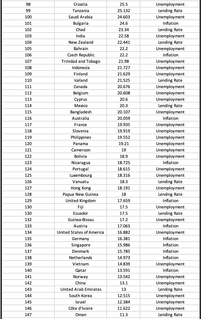 It ranks 134 out of 157 countries with a misery score of 16.882, driven by unemployment, which is a big one if you are unemployed. It's hard to compare this number to previous year based on the changing number of countries ranked and slight changes in methodology (you can if you want, 2021, 2020), but suffice to say, that 16.882 score for 2022 is quite a bit lousier than 2018's figure released in 2019 during the Trump years, which clocked in at 8.7 with the driving misery factor interest rates, or now, bank lending rates.