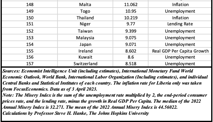 This year, I made a further amendment in Hanke’s Annual Misery Index. Last November, Wall Street Journal columnist Josh Zumbrun penned a column titled “Inflation and Unemployment Both Make You Miserable, but Maybe Not Equally.” In his column, Zumbrun interviewed Andrew Oswald. Leaning on a paper he wrote in 2001 with Rafael di Tella and Robert MacCulloch in the American Economic Review, Oswald argued that the misery index shouldn’t be a simple sum of its elements, but that unemployment should carry a heavier weight. He suggested doubling the unemployment rate. After reading Oswald’s paper, I concluded that Oswald was on to something, and have subsequently adopted his recommendation. So, for the first time, Hanke’s 2022 Annual Misery Index will double the unemployment-rate component.