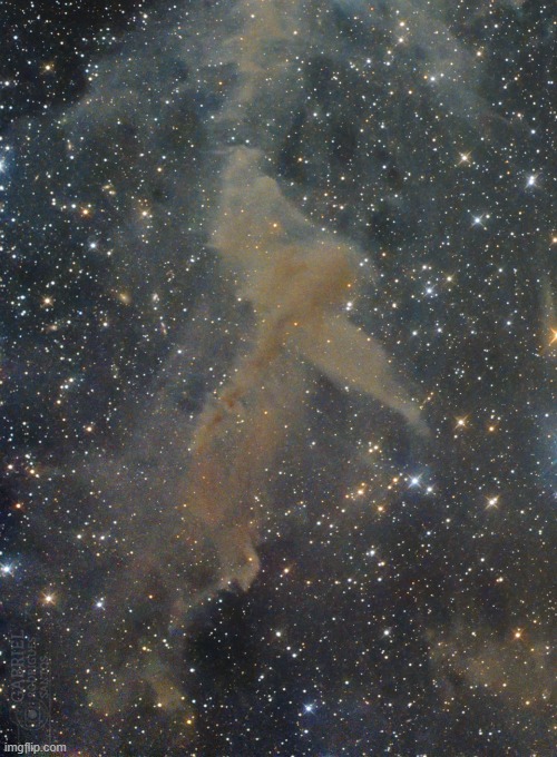 Explanation: The combined light of stars along the Milky Way are reflected by these cosmic dust clouds that soar 300 light-years or so above the plane of our galaxy. Known to some as integrated flux nebulae and commonly found at high galactic latitudes, the dusty galactic cirrus clouds are faint. But they can be traced over large regions of the sky toward the North and South Galactic poles. Along with the reflection of starlight, studies indicate the dust clouds produce a faint reddish luminescence as interstellar dust grains convert invisible ultraviolet radiation to visible red light. Also capturing nearby Milky Way stars and distant background galaxies, this remarkably deep, wide-field image explores a complex of faint galactic cirrus known as Mandel Wilson 9. It spans over three degrees across planet Earth's skies toward the far southern constellation Apus.