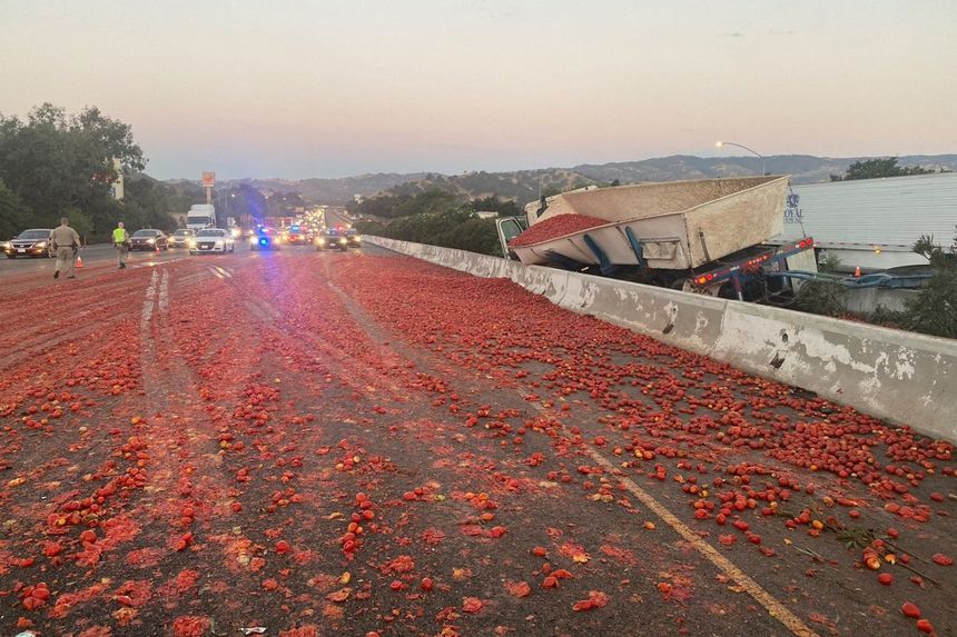 I was told of an incident in Sacramento (many years ago) when a truck loaded with tomatoes for one of the canneries had to slam on its breaks suddenly causing a massive number of tomatoes to fall out onto the freeway. I think that was a lot messier than a bunch of potatoes.