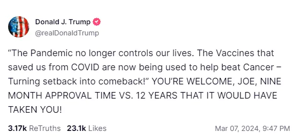 “They were saying it would take five years to get vaccines for COVID! Five years of lockdowns! Didn’t happen, thanks to ME!”