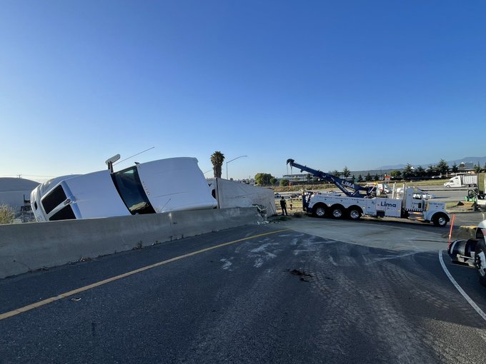 The California Highway Patrol said the overturned truck, carrying about 40,000 pounds of fruit, blocked the northbound connector ramps to Highway 101 and Interstate 880 in San Jose on Wednesday morning and was leaning over a guardrail.
