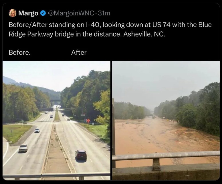 First, in case you missed it, here’s some footage showing the devastation just in Asheville, along with queries about Kamala’s absence: [videos at link]