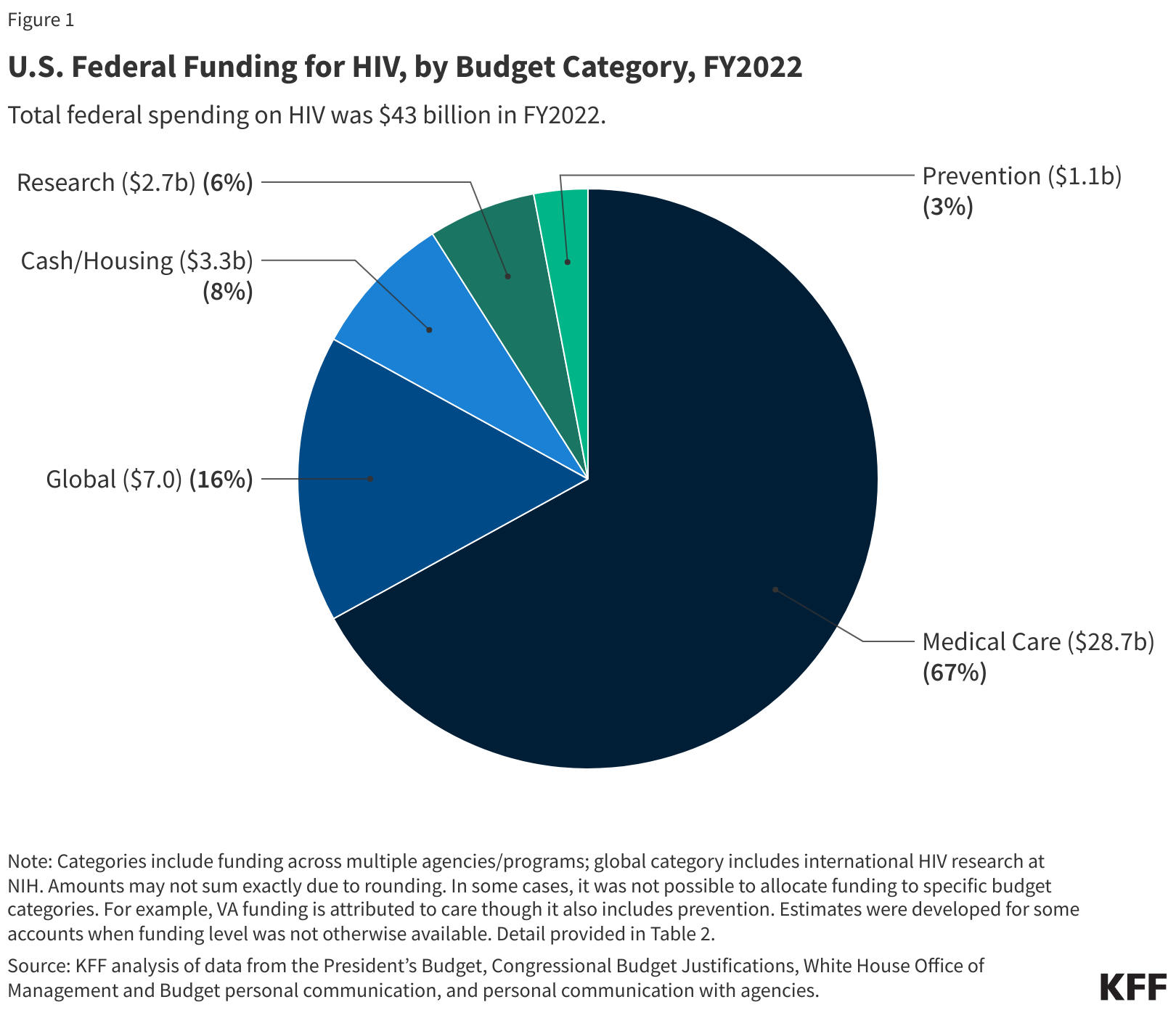 The federal HIV budget can be organized into five broad categories: care & treatment; cash & housing assistance; prevention; research; and global/international. More than two-thirds (67%) of the FY 2022 budget was for domestic care and treatment programs in the U.S.; 8% was for domestic cash/housing assistance; 3% was for domestic HIV prevention; 6% was for domestic HIV research; and 16% was for the global HIV efforts, including funding for international research.