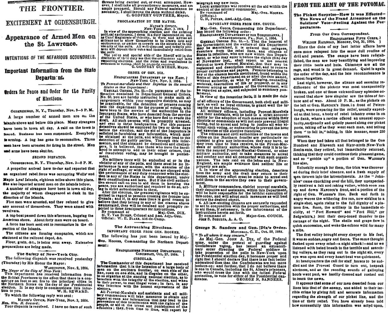 THE FRONTIER: EXCITEMENT AT OGDENSBURGH; Appearance of Armed Men on the St. Lawrence (11/4/1864)