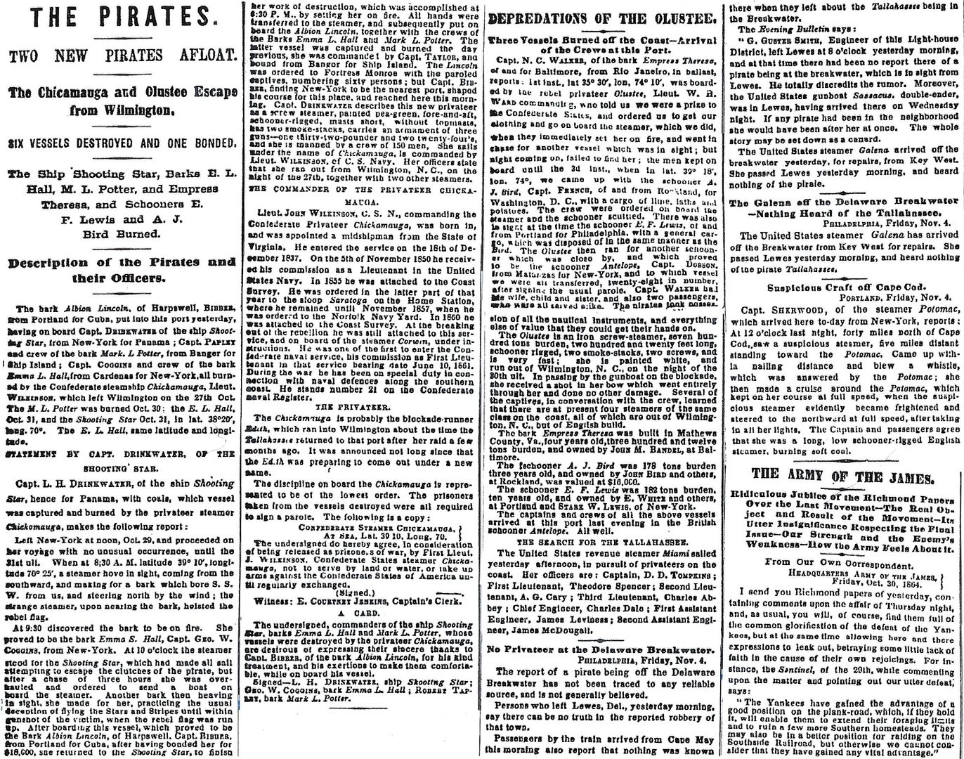 The bark Albion Lincoln, of Harpswell, BIBBER, from Portland for Cuba, put into this port yesterday, having on board Capt. DRINKWATER of the ship Shooting Star, from New-York for Panama; Capt. PAPLEY and crew of the bark Mark L. Potter, from Banger for ship Island; Capt. COGGINS and crew of the bark Emma L. Hall, from Cardenas for New-York, all burned by the Confederate steamship Chickamauga, Lieut. WILKINSON, which left Wilmington on the 27th Oct. The M.L. Potter was burned Oct. 30; the E.L. Hall, Oct. 31, and the Shooting Star Oct. 31, in lat. 38°20′, long. 70°. The E.L. Hall, same latitude and longitude.