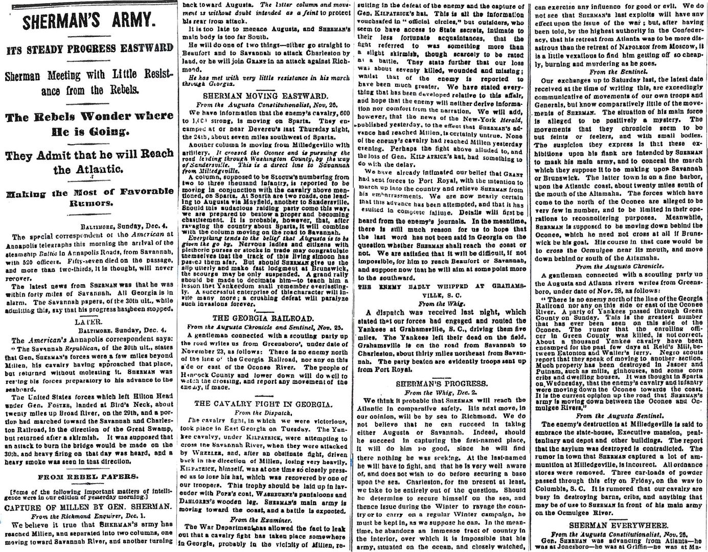 We believe it true that SHERMAN's army has reached Millen, and separated into two columns, one moving toward Savannah River, and another turning back toward Augusta. The latter column and movement is without doubt intended as a feint to protect his rear from attack.
