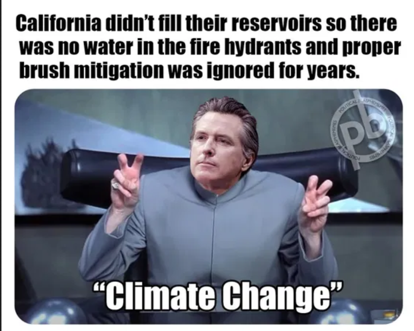 11) Fires are raging in Kollyfornia as firefighters often don’t have the water to fight them due to Newsom’s idiotic water policies. Meanwhile, the scabbagel known as the LA Mayor, Karen Bass, is in Africa tending to the problems of Ghana. The fires are devastating. Actor James Woods saw his house burn down and has no insurance as a major company canceled his (and others’) policy.