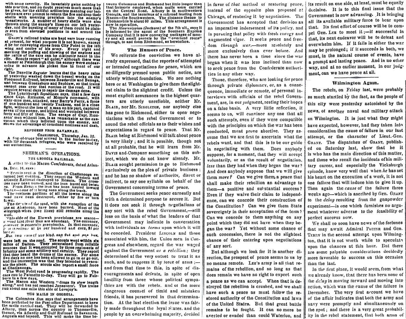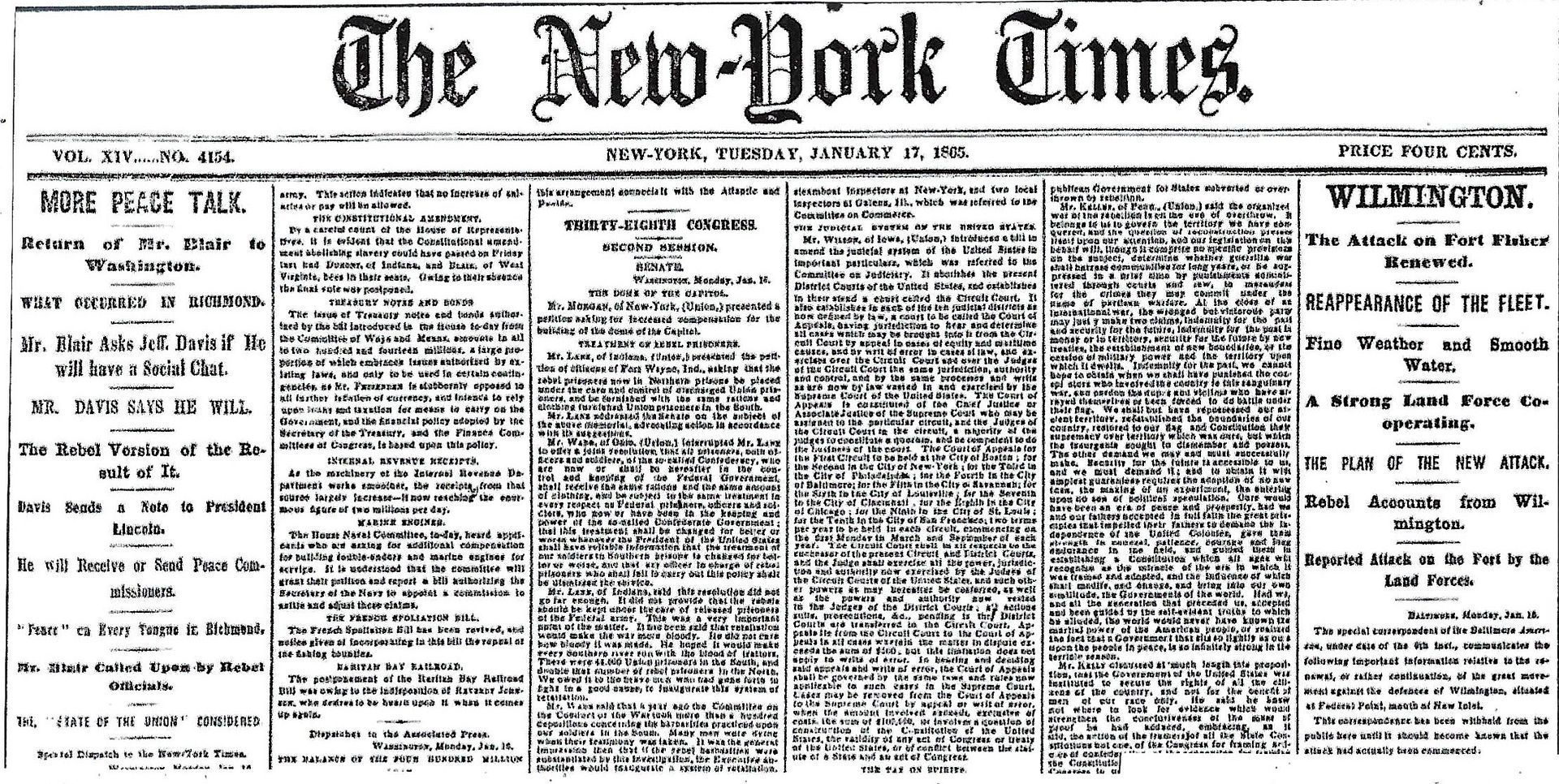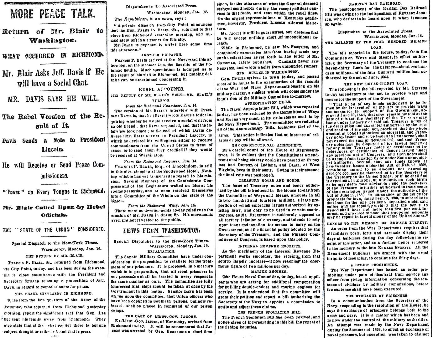 FRANCIS P. BLAIR, Sr., returned from Richmond, via City Point, to-day, and has been during the evening in close consultation with the President and Secretary SEWARD touching a proposition of JEFF. DAVIS in regard to commissioners for peace.