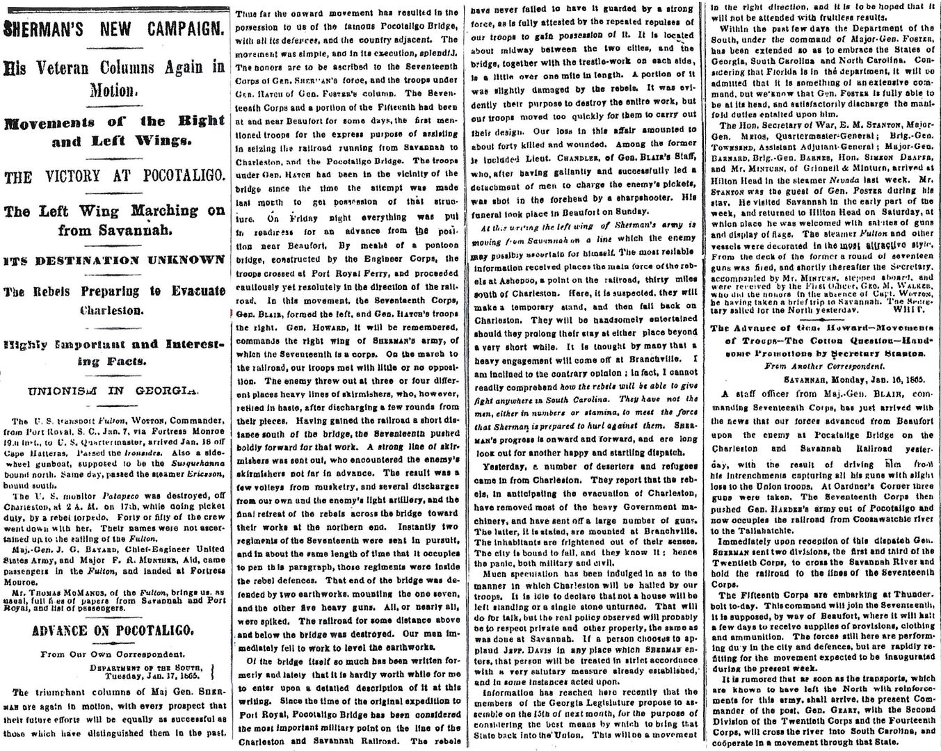The triumphant columns of Maj Gen. SHERMAN are again in motion, with every prospect that their future efforts will be equally as successful as those which have distinguished them in the past. Thus far the onward movement has resulted in the possession to us of the famous Pocotaligo Bridge, with all its defences, and the country adjacent. The movement was simple, and in its execution, splendid. The honors are to be ascribed to the Seventeenth Corps of Gen. SHERMAN's force, and the troops under Gen. HATCH of Gen. FOSTER's column. The Seventeenth Corps and a portion of the Fifteenth had been at and near Beaufort for some days, the first mentioned troops for the express purpose of assisting in seizing the railroad running from Savannah to Charleston, and the Pocotaligo Bridge. The troops under Gen. HATCH had been in the vicinity of the bridge since the time the