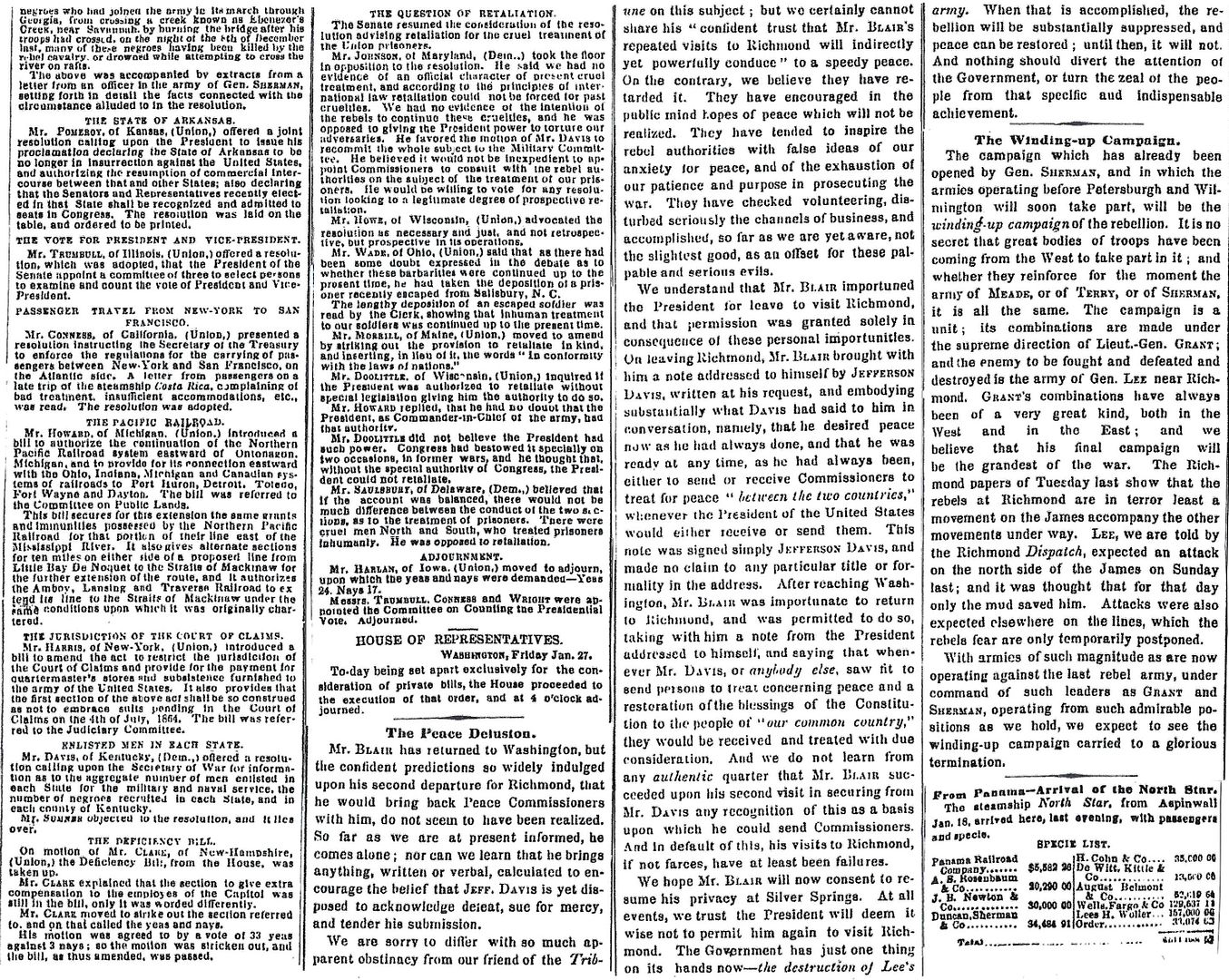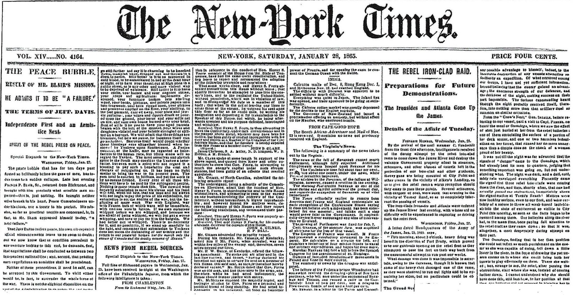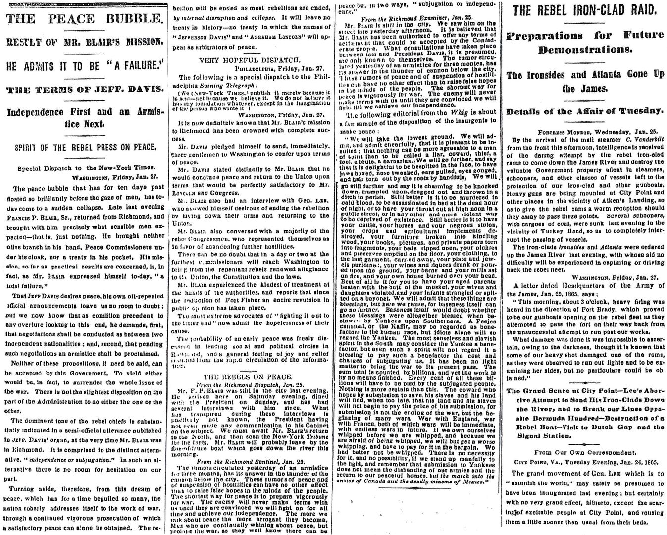“The peace bubble that has for ten days past floated so brilliantly before the gaze of men, has to-day come to a sudden collapse. Late last evening FRANCIS P. BLAIR, Sr., returned from Richmond, and brought with him precisely what sensible men expected — that is, just nothing.”
