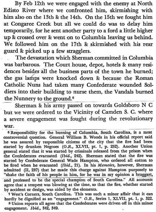 Diary of 5th Sergeant Alexander G. Downing: Monday, February 13, 1865 (“Our corps started out at 7 o’clock this morning and after destroying twenty-six miles of railroad, marched fifteen miles, on the State road from Charleston to Columbia”)