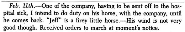 Diary of 5th Sergeant Alexander G. Downing: Saturday, February 11, 1865 (“There was some skirmishing in front, and our forces routed the enemy from some strong positions.”)