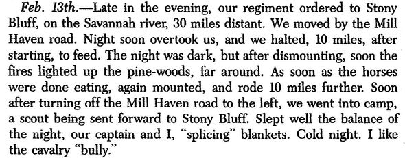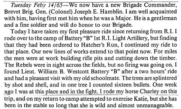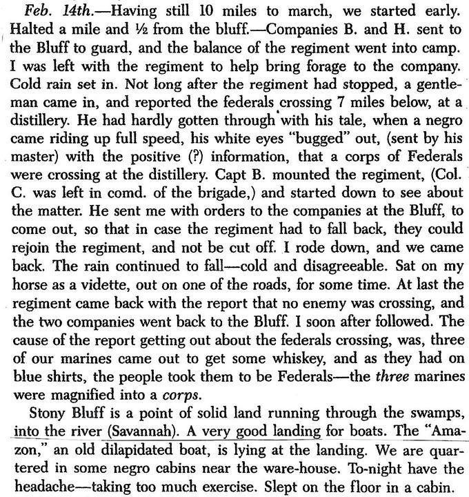 Diary of 5th Sergeant Alexander G. Downing: Tuesday, February 14, 1865 (“We started to move forward at 9 a. m. and after an easy march of twelve miles1 went into camp for the night. The rebels are still retreating before us.”)