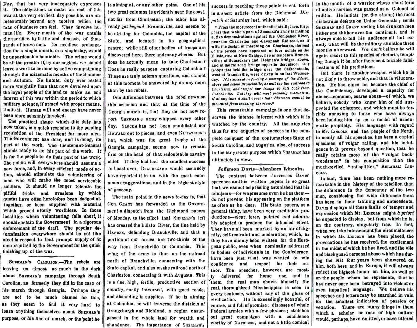 From the most recent authentic intelligence, it appears that while a part of SHERMAN's army is making active demonstrations against the Combahee Ferry near the Charleston and Savannah Railroad, as if with the design of marching on Charleston, the rest of his forces have appeared at four points on the Edisto, viz.: at New-Bridge, five miles below Branchville; at Bumacker's and Holman's bridges, above,