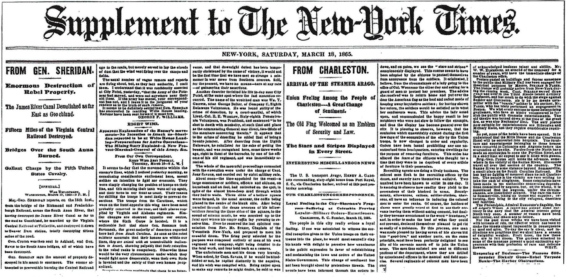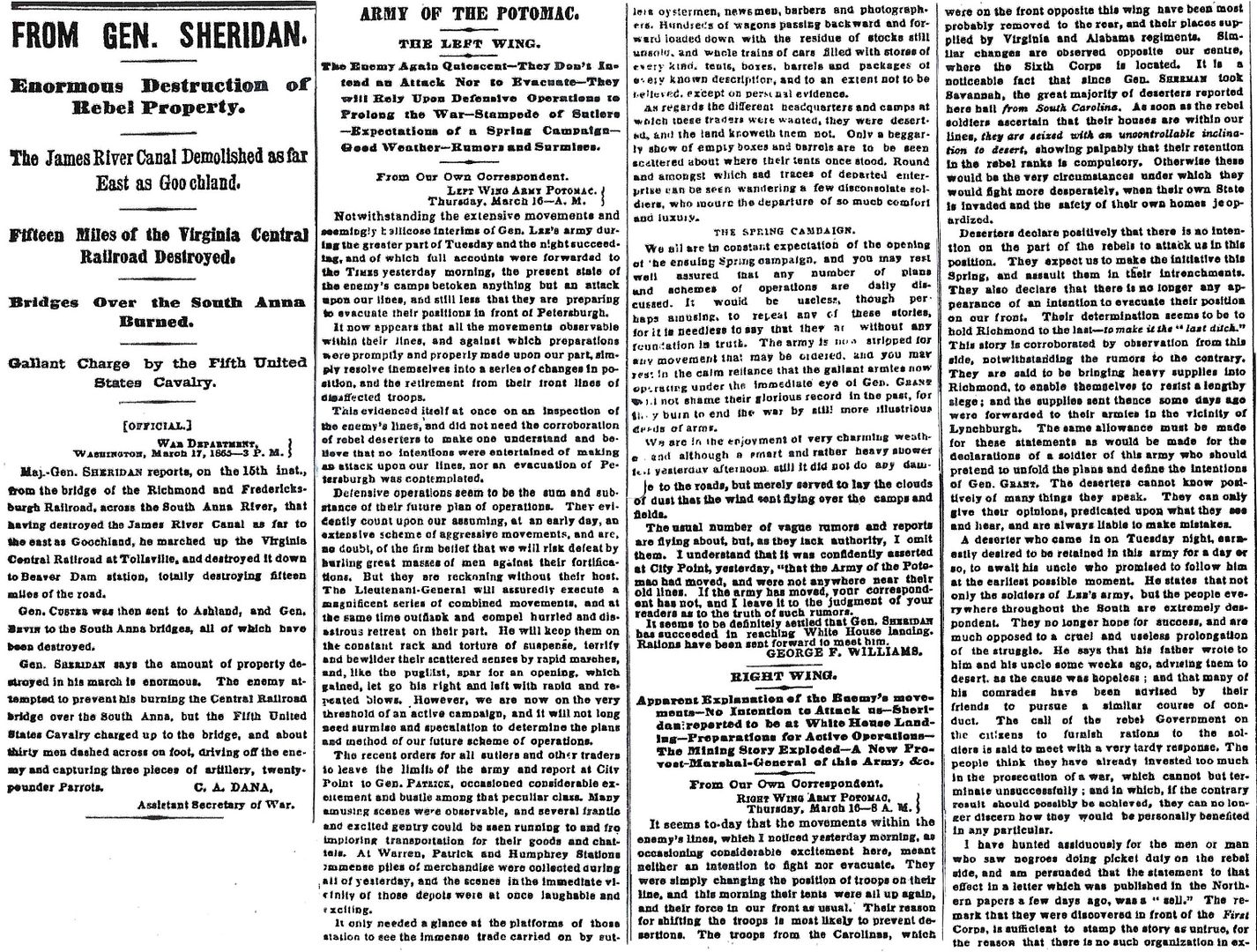 Maj.-Gen. SHERIDAN reports, on the 15th inst., from the bridge of the Richmond and Fredericks- burgh Railroad, across the South Anna River, that having destroyed the James River Canal as far to the east as Goochland, he marched up the Virginia Central Railroad at Tollsville, and destroyed it down to Beaver Dam station, totally destroying fifteen miles of the road.