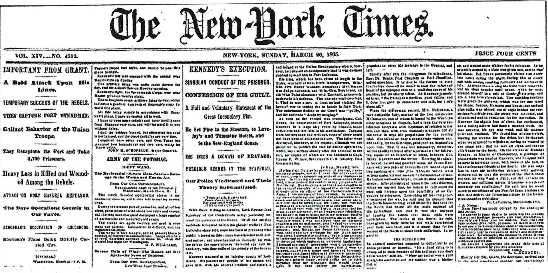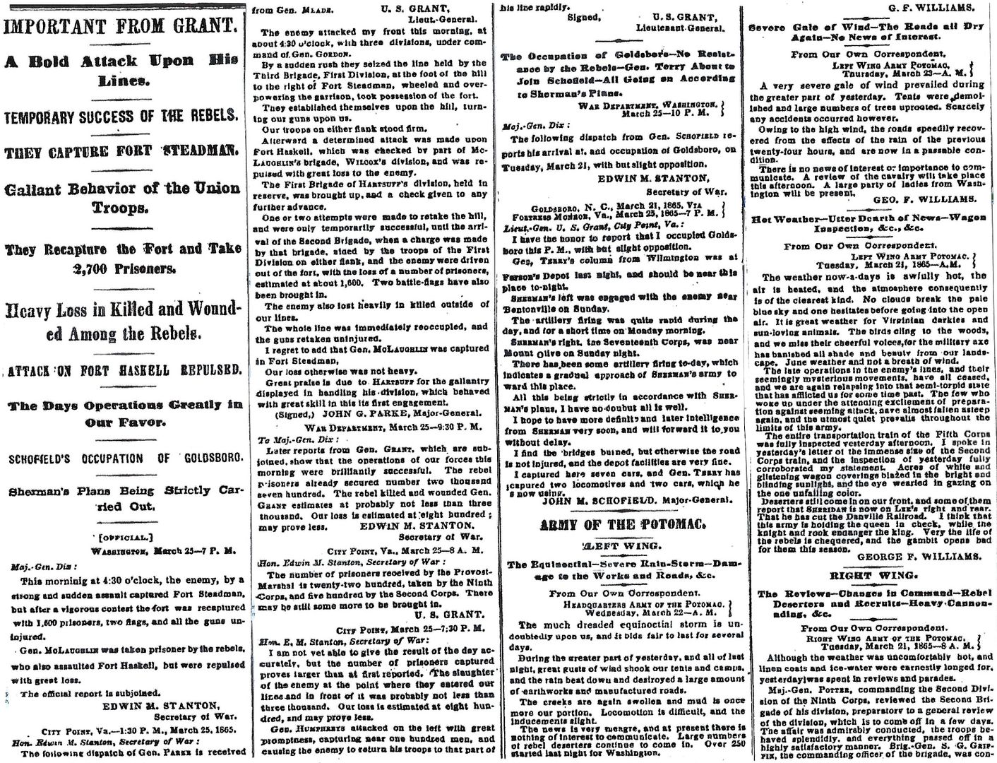 This morning at 4:30 o'clock, the enemy, by a strong and sudden assault captured Fort Steadman, but after a vigorous contest the fort was recaptured with 1,600 prisoners, two flags, and all the guns uninjured.