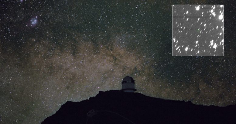 The approaching asteroid was observed using the 2.5-meter Nordic Optical Telescope (NOT) in La Palma, Canary Islands. The image in the top right corner shows the asteroid detected by the telescope in the centre of the green circle. The other bright spots are background stars, smeared due to the movement of the telescope. Credit: Viktoria Pinter, Zuri Gray