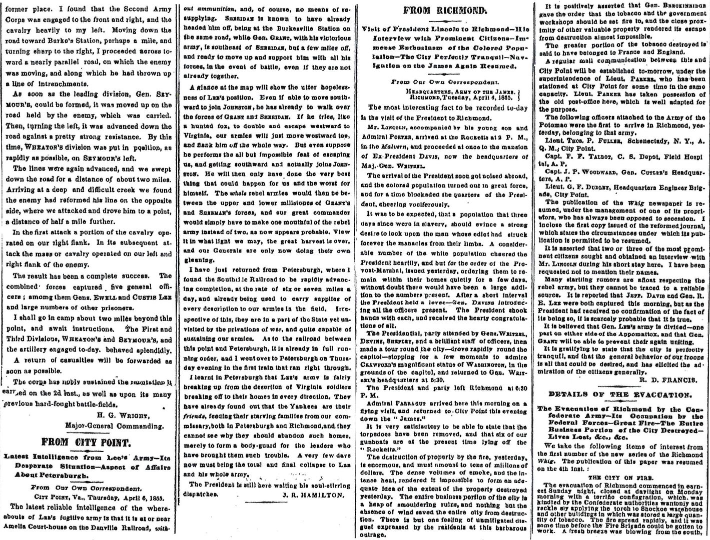 I attacked them with two divisions of the Sixth Army Corps, and routed them handsomely, making a connection with the cavalry. I am still pressing on with the cavalry and infantry. Up to the present time we have captured Gens. EWELL, KERSHAW, BUTTON, CORSE, DEBARE and CUSTIS LEE, several thousand prisoners fourteen pieces of artillery, with caissons, and a large number of wagons. If the thing is pressed I think LEE will surrender.