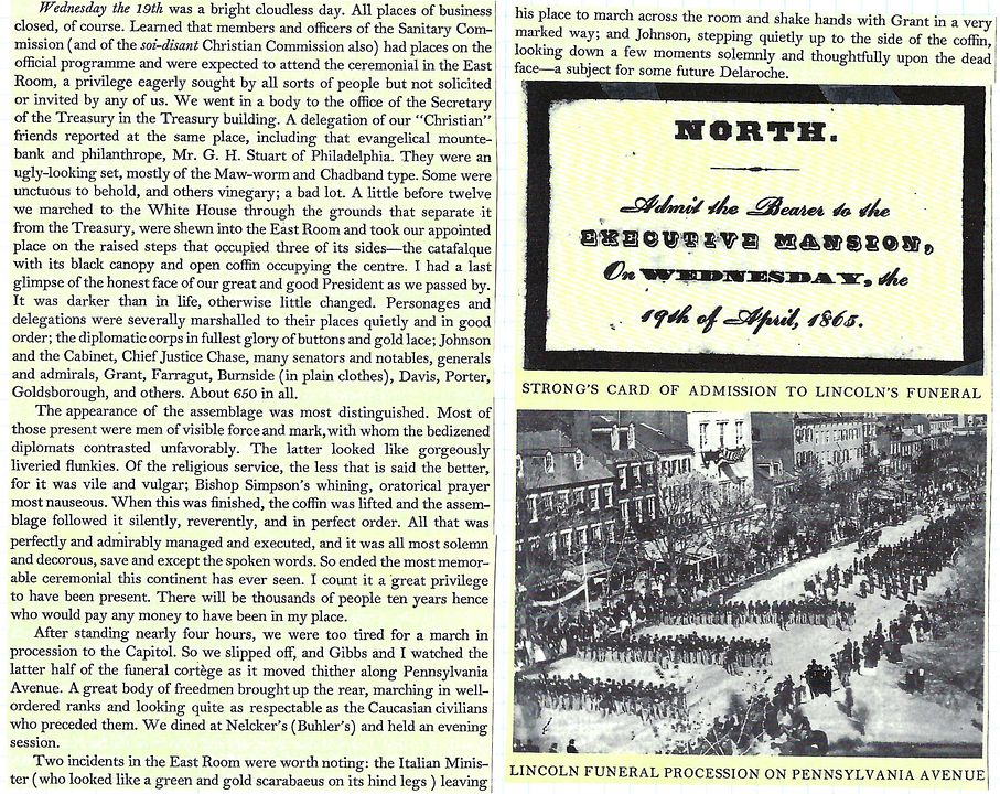 Diary of Gideon Welles: Wednesday, April 19, 1865 (“The funeral was imposing, sad, and sorrowful. All felt the solemnity, and sorrowed as if they had lost one of their own household.”)
