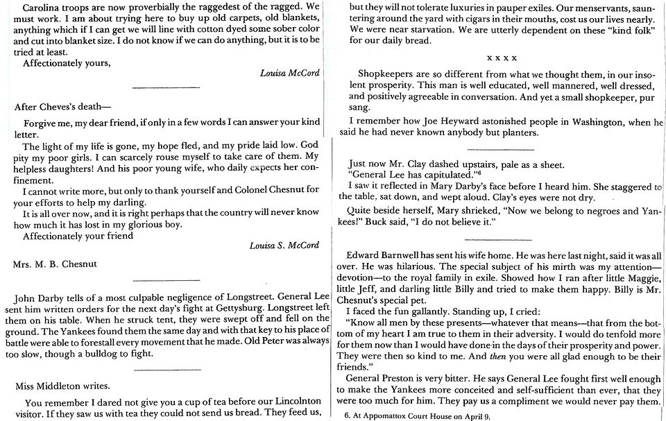 Diary of Judith Brockenbrough McGuire: April 20, 1865 (“Two other friends came forward to share with us their little all. God help the warm hearts of our conquered but precious country!”)