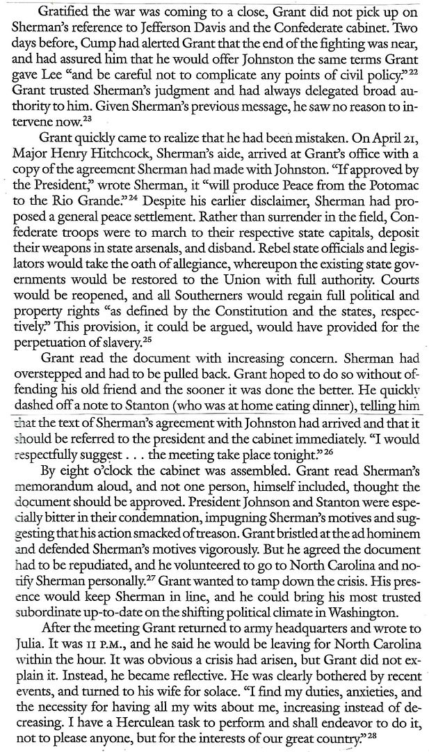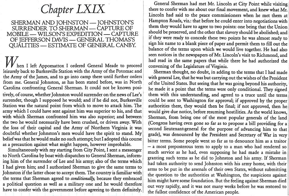 Major-General William T. Sherman to Lieutenant-General Ulysses S. Grant and Major-General Henry W. Halleck, April 18, 1865 (“I inclose herewith a copy of an agreement made this day between General Joseph E. Johnston and myself, which, if approved by the President of the United States, will produce peace from the Potomac and the Rio Grande.”)