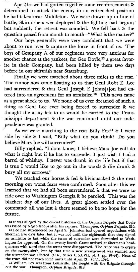 Major Charles Wright Wills: April 18, 1865 (“Sherman has gone out again to see Johnston. Johnston asked for another day in order to see Davis and get his permission to surrender the whole force in arms this side of the Mississippi.”)