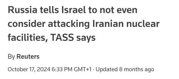 The Russians have already been paid off. We moved 20K Patriot missiles reserved for Ukraine and sent them to Israel. Putin knew and this was all discussed with him last Sunday/Monday when Trump Truthed that Russia could be helpful with Iran. Russia has to saber rattle but they are not going to do anything about it.