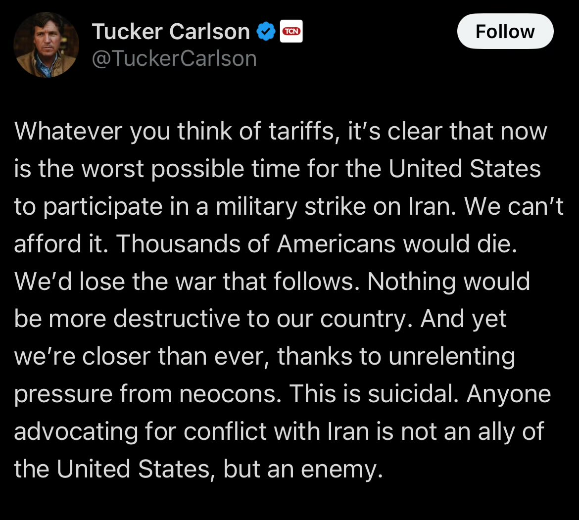 Looks like a big war is brewing. This might end the rule of the Mad Mullahs in Iran—and that would be a good thing. It might also be the end of Bibi in Israel and his endless wars. Ideal outcome—a secular Iran maybe with the shah’s son on the thrown as a limited monarch. Still this could spin out of control fast if Turkey or Egypt gets in the fight. If Israel suffers any set back—we will be forced into the battle. Russia is too busy in Ukraine to get involved. It would be great if the Mullahs were forced to scale back their theocratic control and if Iran went back to the worship of Zoroaster.