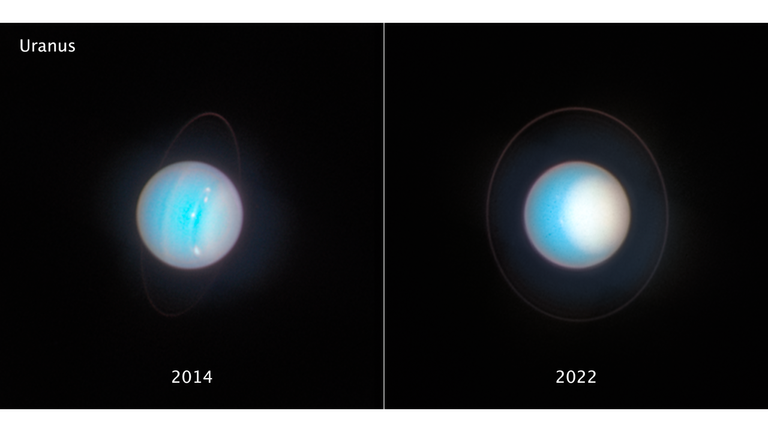 These side-by-side images of Uranus, taken eight years apart by NASA’s Hubble Space Telescope, show seasonal changes in the planet’s reflectivity. The left image shows the planet seven years after its northern spring equinox when the Sun was shining just above its equator. The second photo, taken six years before the planet’s summer solstice, portrays a bright and large northern polar cap. Credit: NASA, ESA, STScI, A. Simon (NASA-GSFC), M. H. Wong (UC Berkeley), J. DePasquale (STScI)