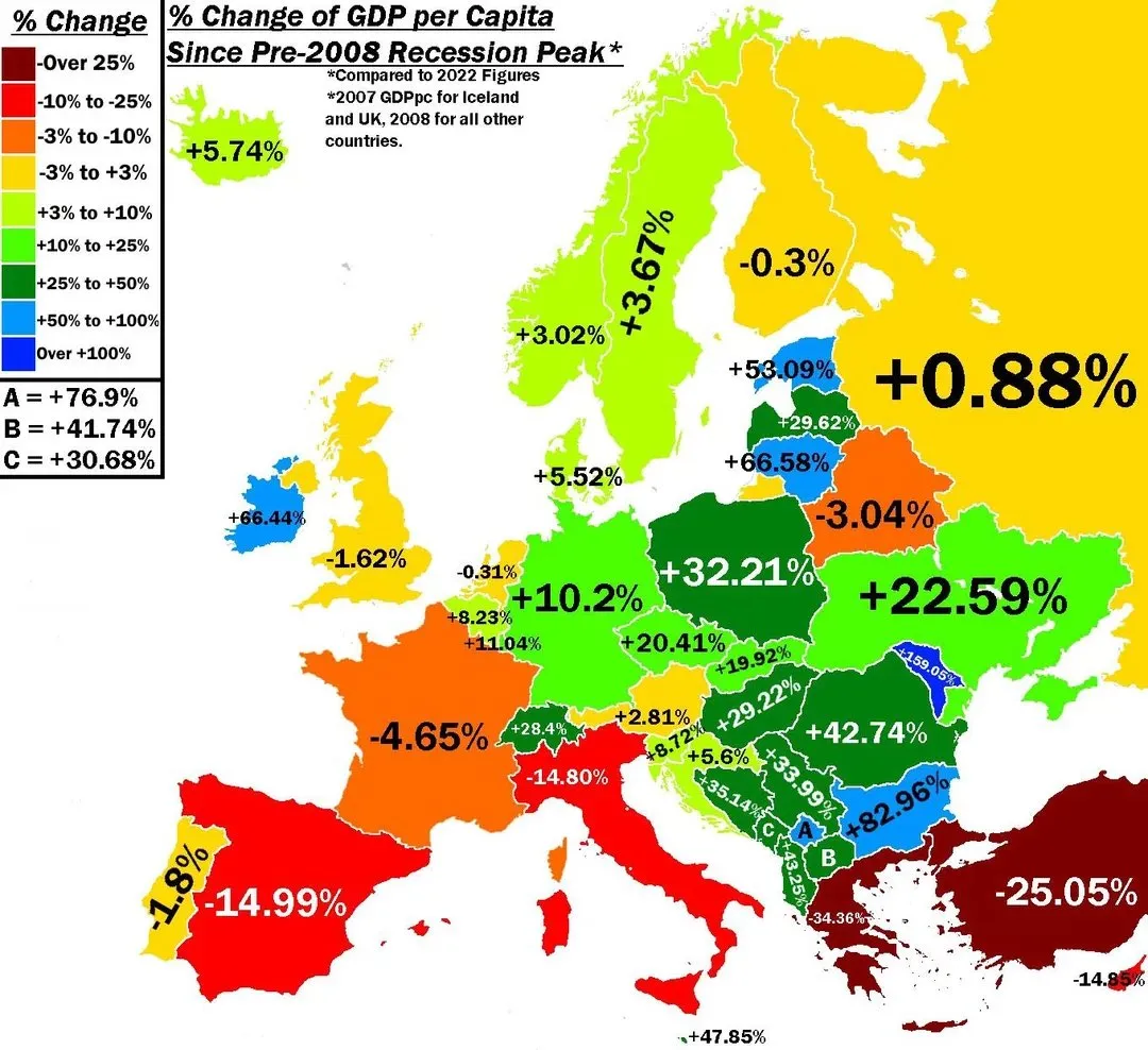 a fair bit of europe, especially the south, has been in meaningful decline for decades. per capita GDP is shrinking.