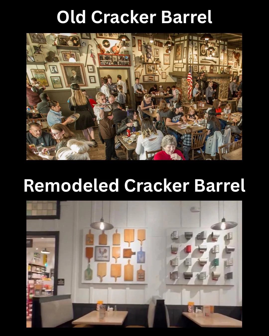 1) Woke people who pretend to live healthy lives don't eat there anyway -- you know, because of the biscuits, gravy, fried chicken, calories, fat, etc., where just one glass of sweet tea likely has more calories than they consume in a day. Somehow CB thinks taking the "country" out of Cracker Barrel, removing the old white dude and his barrel from the logo, and making the decor look like a latte cafe will entice them in. (I have a bridge to sell you).