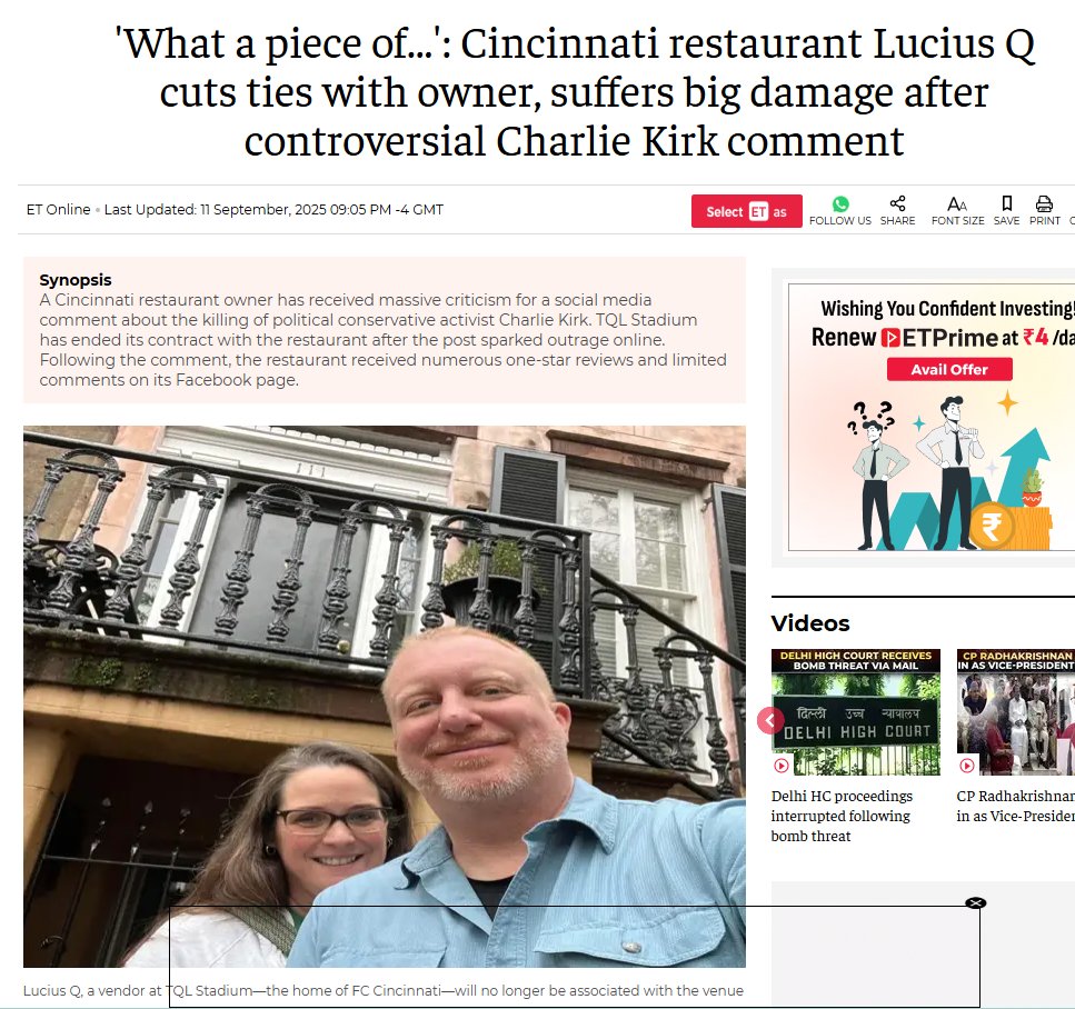 It comes after the co-owner made negative comments on social media regarding Charlie Kirk's death.https://t.co/DJpCuzB2w8 pic.twitter.com/ATSWngxj43— Local 12/WKRC-TV (@Local12) September 12, 2025