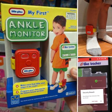 The image was styled to resemble a 'Little Tikes' toy package, with the mock toy labeled 'My First Ankle Monitor.'