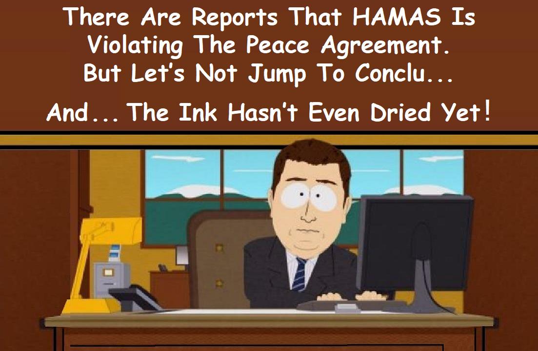 Hamas has already violated the agreement. They have not disarmed, but are roaming about shooting those they consider traitors to the cause. As far as I know there is no one monitoring them closely to assure disarming.