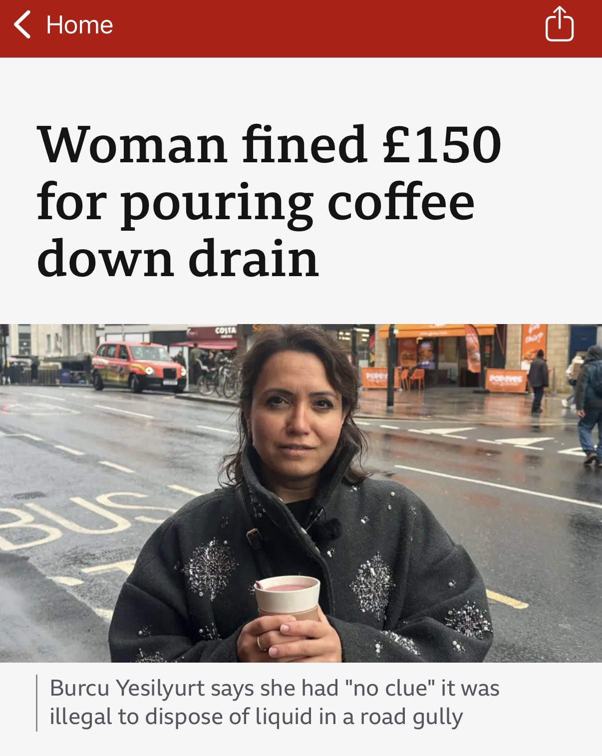 As soon as the drop of java dribbled out, Yesilyurt was immediately swarmed by three officers at the bus stop and slapped with a £150 (roughly $200) fine under Section 33 of the Environmental Protection Act 1990, which makes it illegal to dump waste in a way that could pollute land or water, including pouring liquids into street drains.