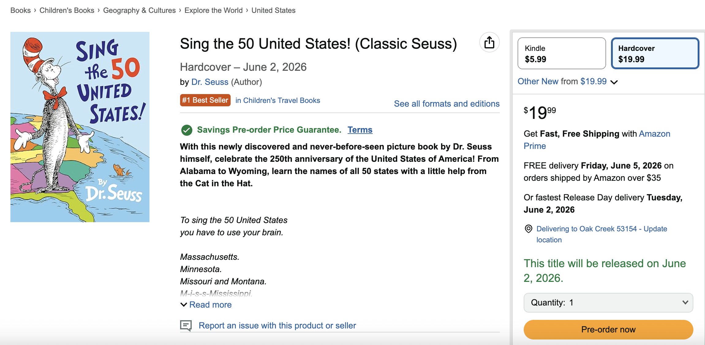 The book will follow the Cat in the Hat and two cat helpers as they teach you to learn and name the 50 states.
