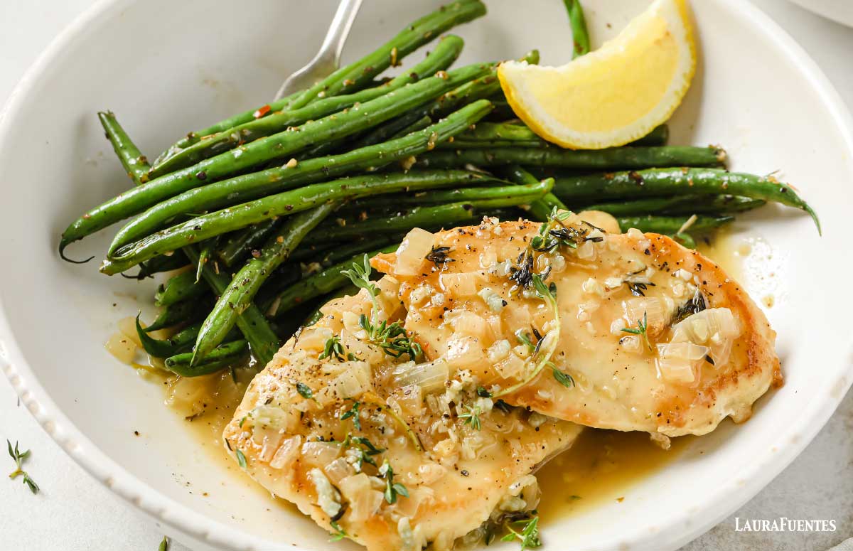 For green beans-- 1 lb fresh green beans 2 tbl butter 2 minced gar/cl 2 tsp Italian seasoning Pinch red pepper flakes, s/p, ¼ c water, lemon wedges.
