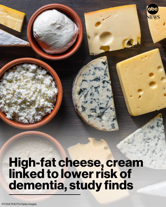 People who regularly ate higher-fat cheese and cream had a lower risk of developing dementia over 25 years, according to a new study. https://t.co/zN2g8XcEua pic.twitter.com/0gyvIcDQ91— ABC News (@ABC) December 18, 2025
