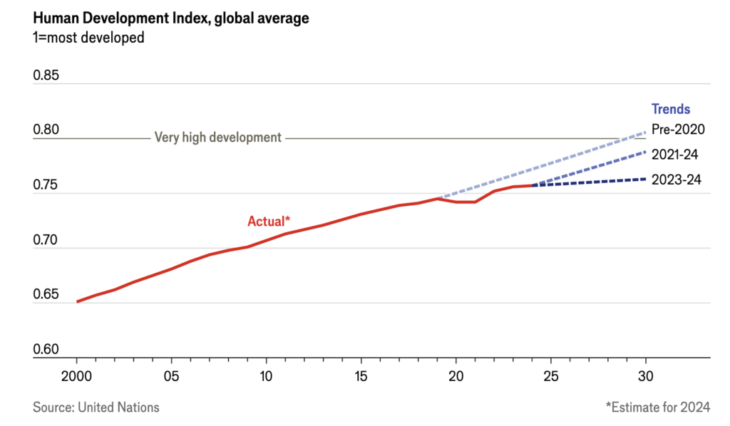 The bottom of the index is dominated by sub-Saharan Africa. Life expectancy at birth in South Sudan, the lowest-ranked country, is less than 58 years, average schooling is less than six years and gross national income per person is just $688. After decades of narrowing, the gap between countries at the top and bottom of the index has widened for four years running. The world’s poorest countries have stalled on other indicators, too. Extreme poverty has barely fallen since 2015. Measures of public health have declined since covid. And since the mid-2010s economic growth rates in poor economies have been slower on average than in richer ones. Cuts to aid budgets by governments in America and Europe will make things worse for poor countries. According to the HDI, countries in the Arab world and Latin America and the Caribbean have had the slowest post-pandemic recovery in living standards.