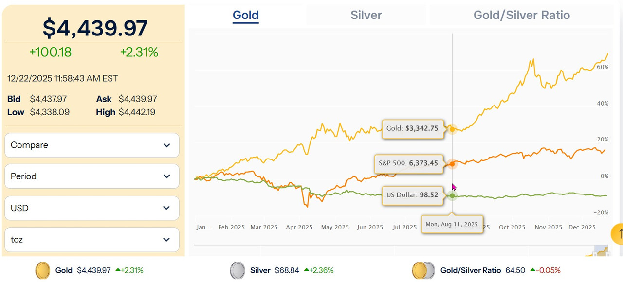Gold was last seen at a record $4,445.8 per ounce while spot gold was last trading at $4,414.99. Prices are up nearly 70% since the start of the year.