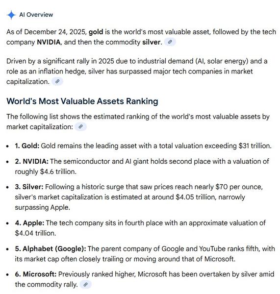 Silver’s market value has reached about $4.04 trillion, slightly higher than Apple’s $4.02 trillion at the close of trading on Wall Street on Tuesday..