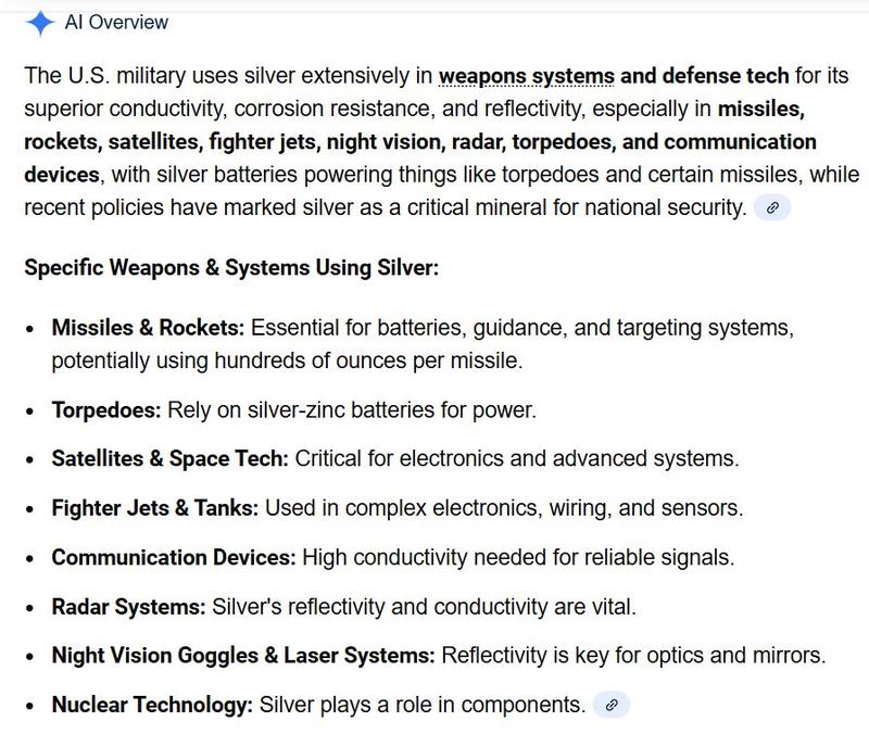 Industrial power – Silver is indispensable for high‑efficiency solar cells, advanced semiconductors, sensors, and precision manufacturing. Economic power – By controlling export flows and stockpiles, China can tighten or relax silver supply to influence inflation, production costs, and trade balances in rival economies. Technology power plus Robotics– From AI data centers and 5G infrastructure to EVs and next‑gen batteries, silver is baked into the hardware of the digital and green revolutions. Military power – Guidance systems, radar, secure communications, drones, missiles, torpedoes, and space assets all depend on silver‑rich electronics and specialized components. Silver is no longer just “poor man’s gold.” It is an arms‑race metal, and China’s decision to hoard, premium‑price, and restrict exports into 2026 is a declaration that the race is officially on. It is predicted that USA will not just roll over but try and win this war.