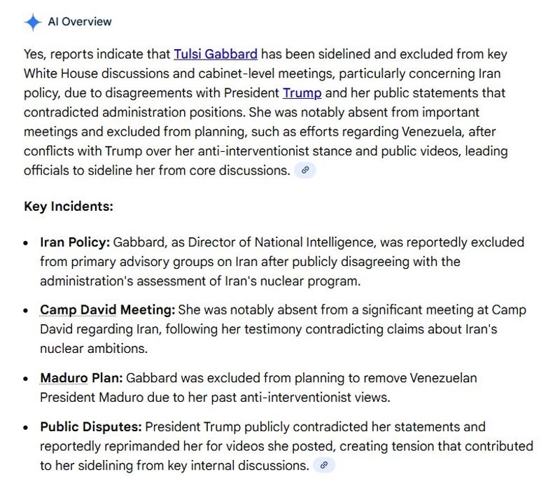 Trump assembled a Cabinet of Peers and obviously they’re not always going to see eye-to-eye on things. I’d rather have Tulsi contributing where she can and occasionally being excluded or over-ruled than to have a Cabinet made up of nothing but ass-kissing sycophants.
