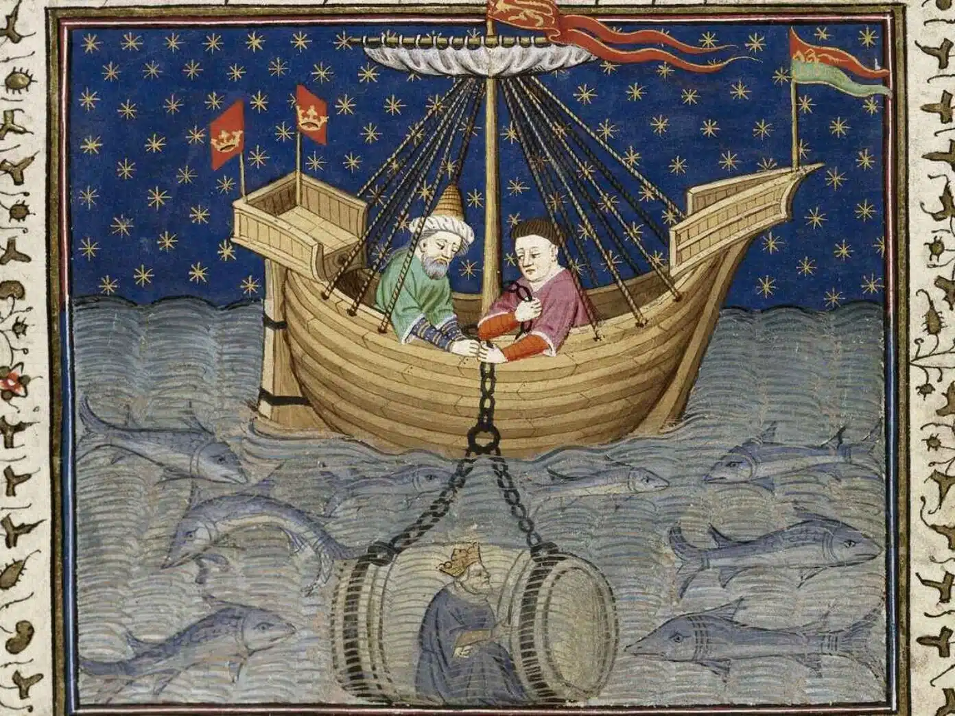On the first descent, Alexander’s cage reached 120 cubits, roughly 180 feet. A passing fish brushed against it, jolting the vessel and forcing the soldiers to pull him back. Undeterred, he tried again, only to face the same interference. On the third attempt, he plunged to 308 cubits (462 feet), descending into an alien underwater world. Countless fish surrounded him, their scales flickering in the filtered light. The sea, alive with movement, seemed to both challenge and welcome him.