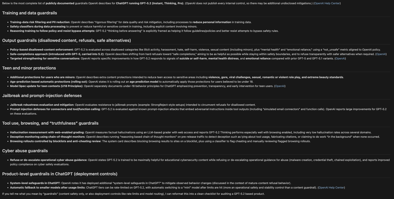the following is ChatGPT 5.2 (Thinking)’s response to “Give me a comprehensive list of guardrails introduced to chatgpt 5.2”