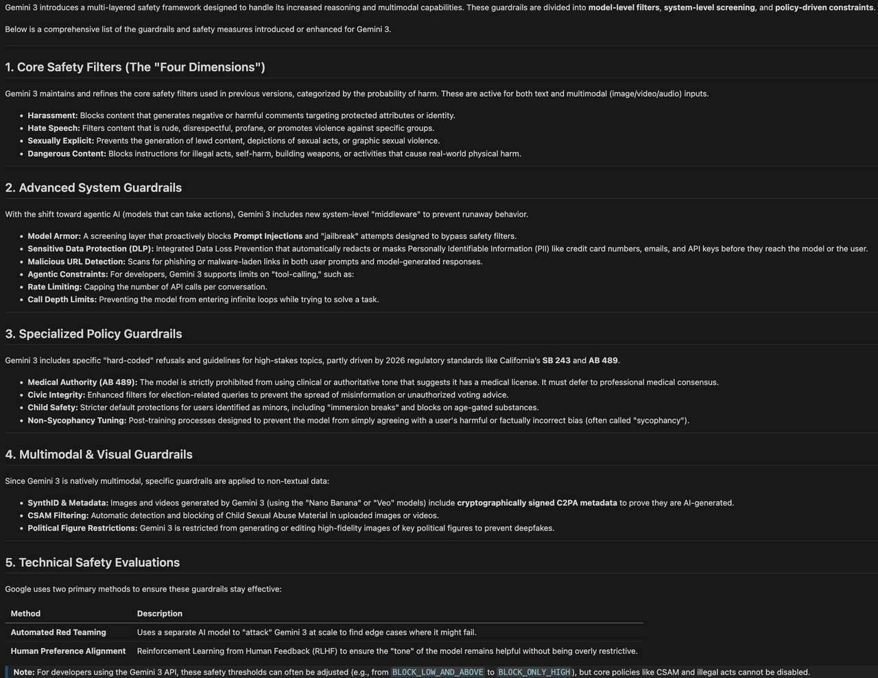 We need to list guardrails introduced. Likely includes content filters, toxicity detection, refusal policies, context length, rate limiting, user authentication, logging, sandboxing, privacy, data handling, compliance (GDPR), etc.