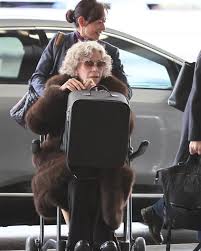 The wheelchair was operated by a woman who appeared to be from the airline staff, with Fonda carrying two small bags in her lap as her other luggage sat on a trolley.